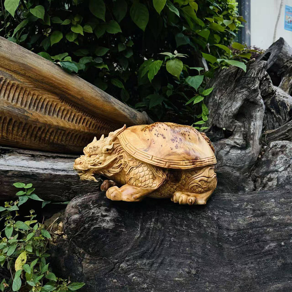 龍龜,瑞獸一種,主吉祥招財,化三煞。龍龜是龍和龜的結合物,因此更具有靈瑞之氣。為古代神龍所生之子,相傳龍生九子不成龍,其中一子頭似龍,形似龜,在民間稱之為龍龜。背負河圖洛書,揭顯天地之數,物物一太極,上通天文,下知地理,中和人世;龜背、龜尾有制煞解厄之效,龍頭有賜福之意。故傳統的五術風水界,一向以來皆以「龍龜」為風水制化的聖品,龍龜擺放家中,有安家、鎮宅、避邪、保平安之意。另外,"龍龜"有榮歸,榮譽歸來、衣錦還鄉、榮歸故里之意。