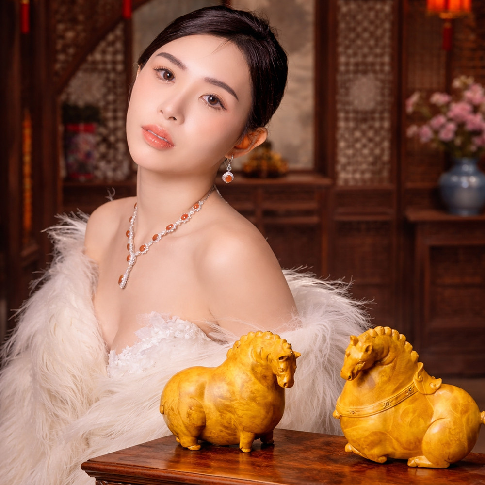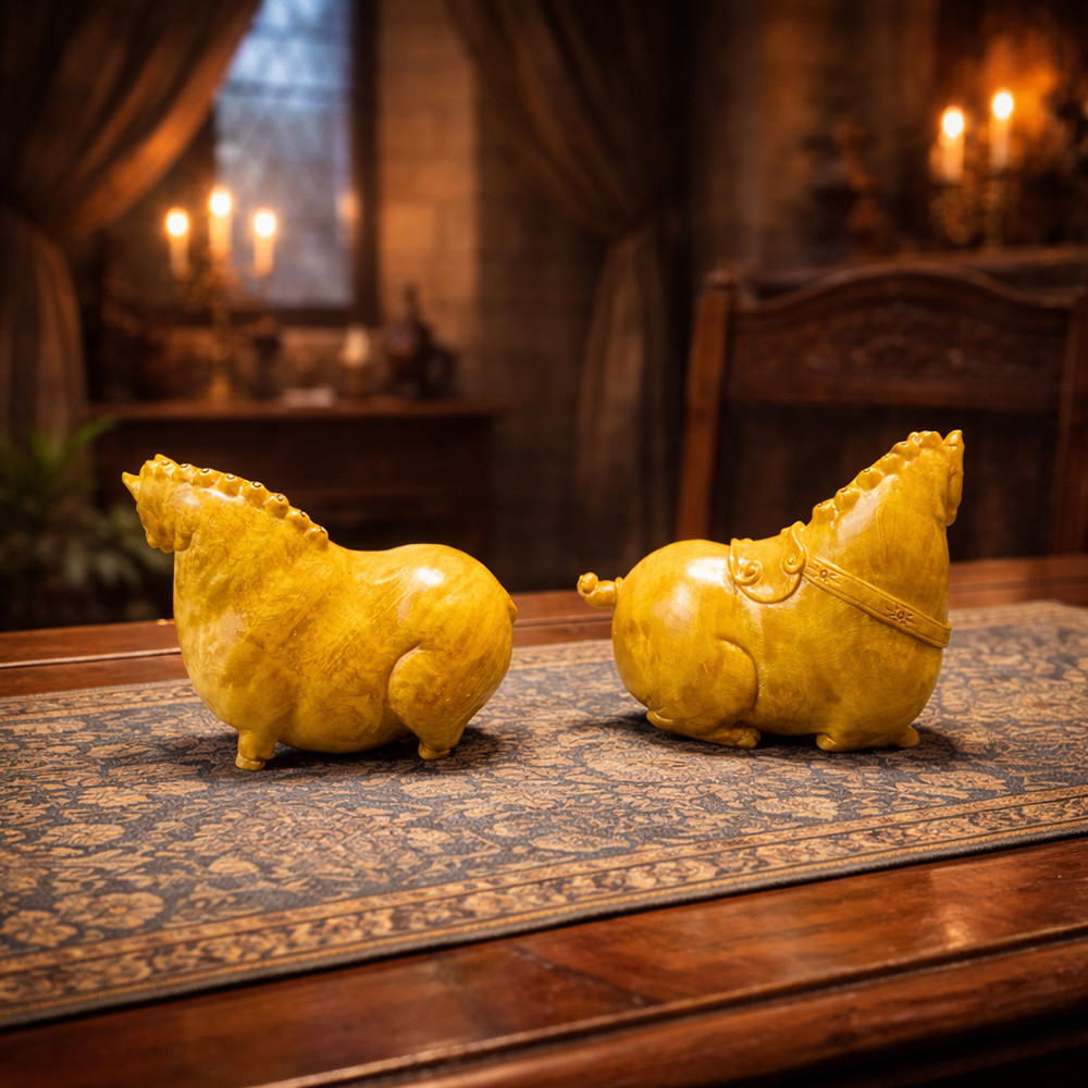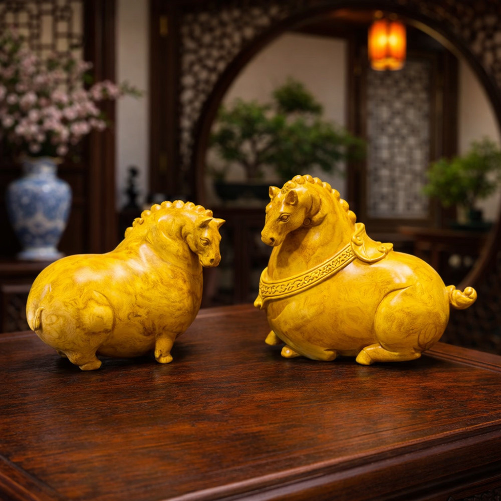 唐馬黃金樟瘤木雕一對