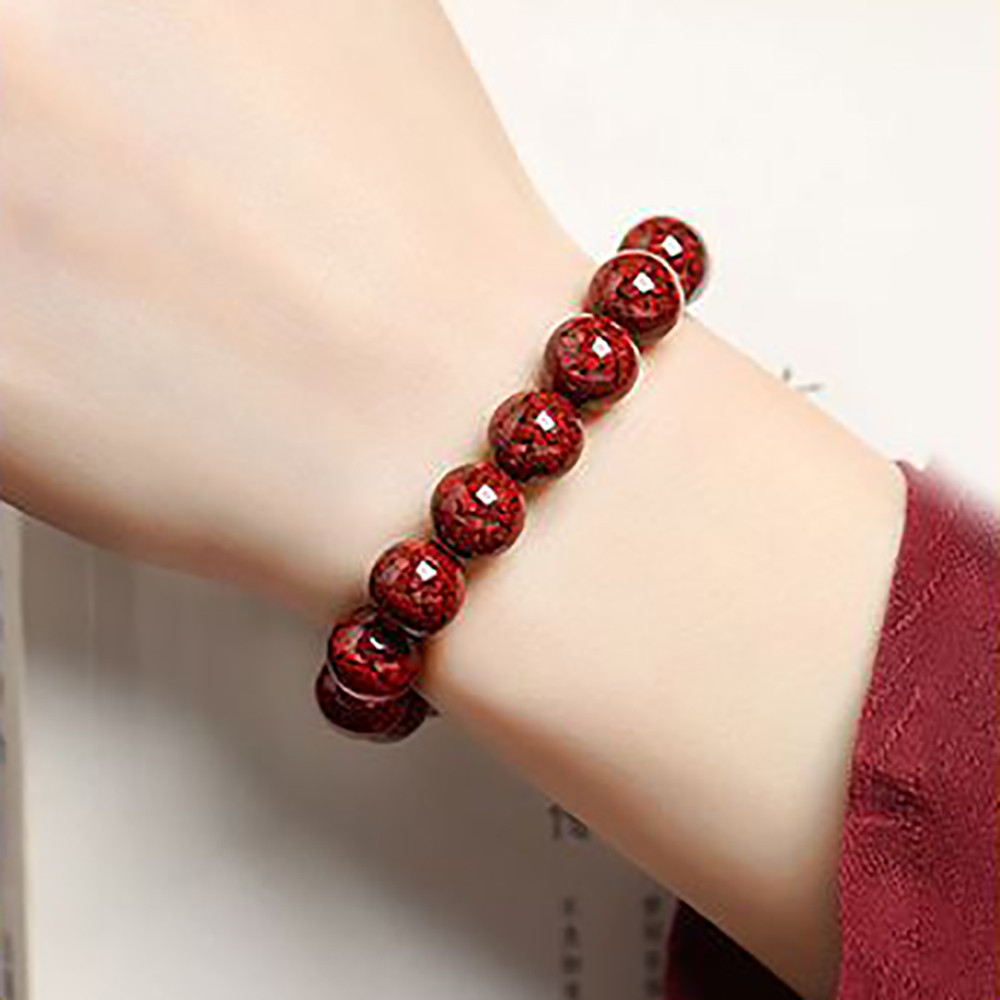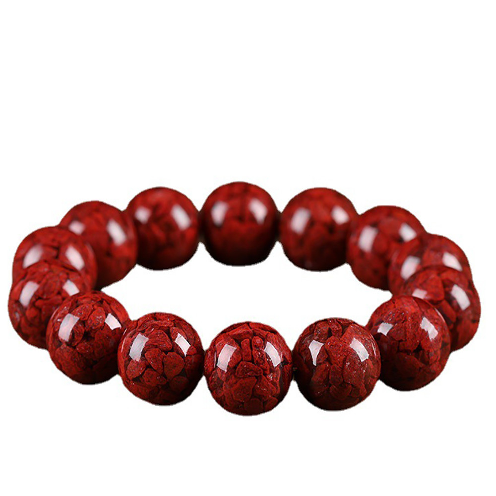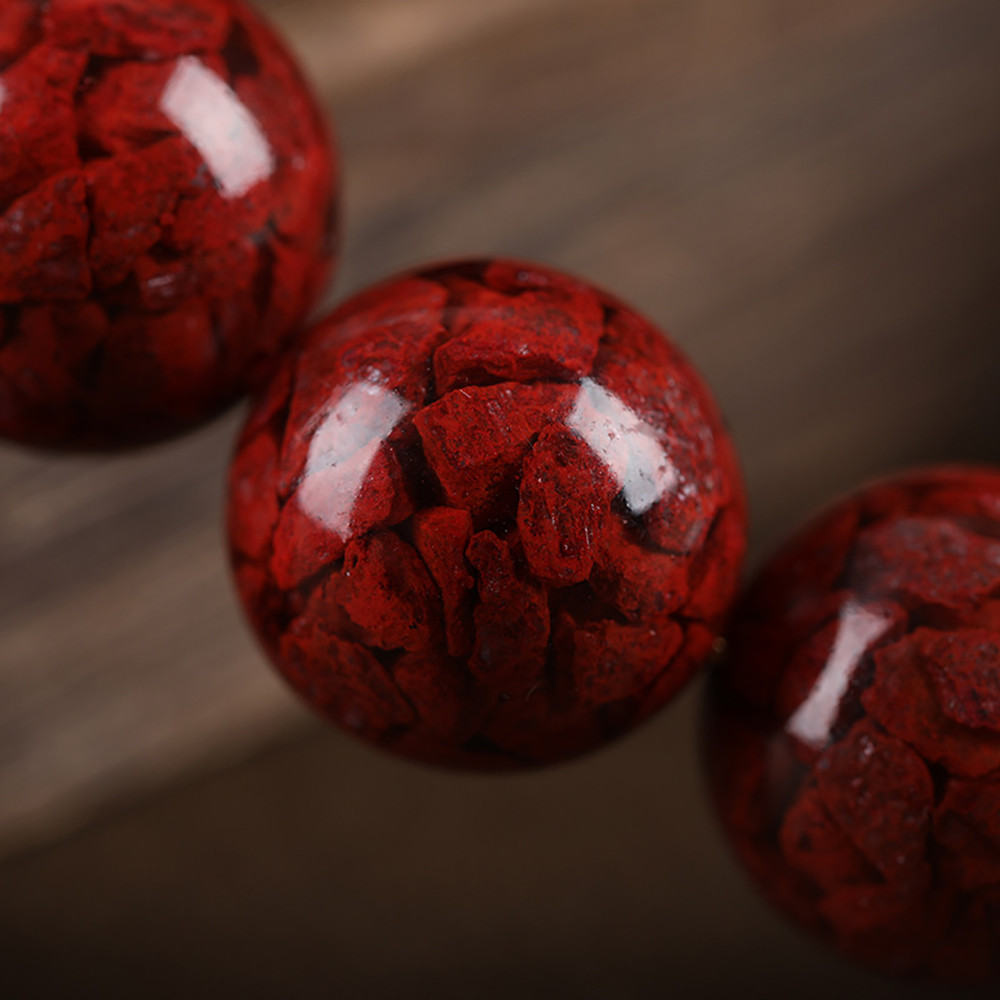 晶體硃砂切粒聚合而成珠體。可明顯看出硃砂原礦結晶細膩金色閃光點狀晶體。